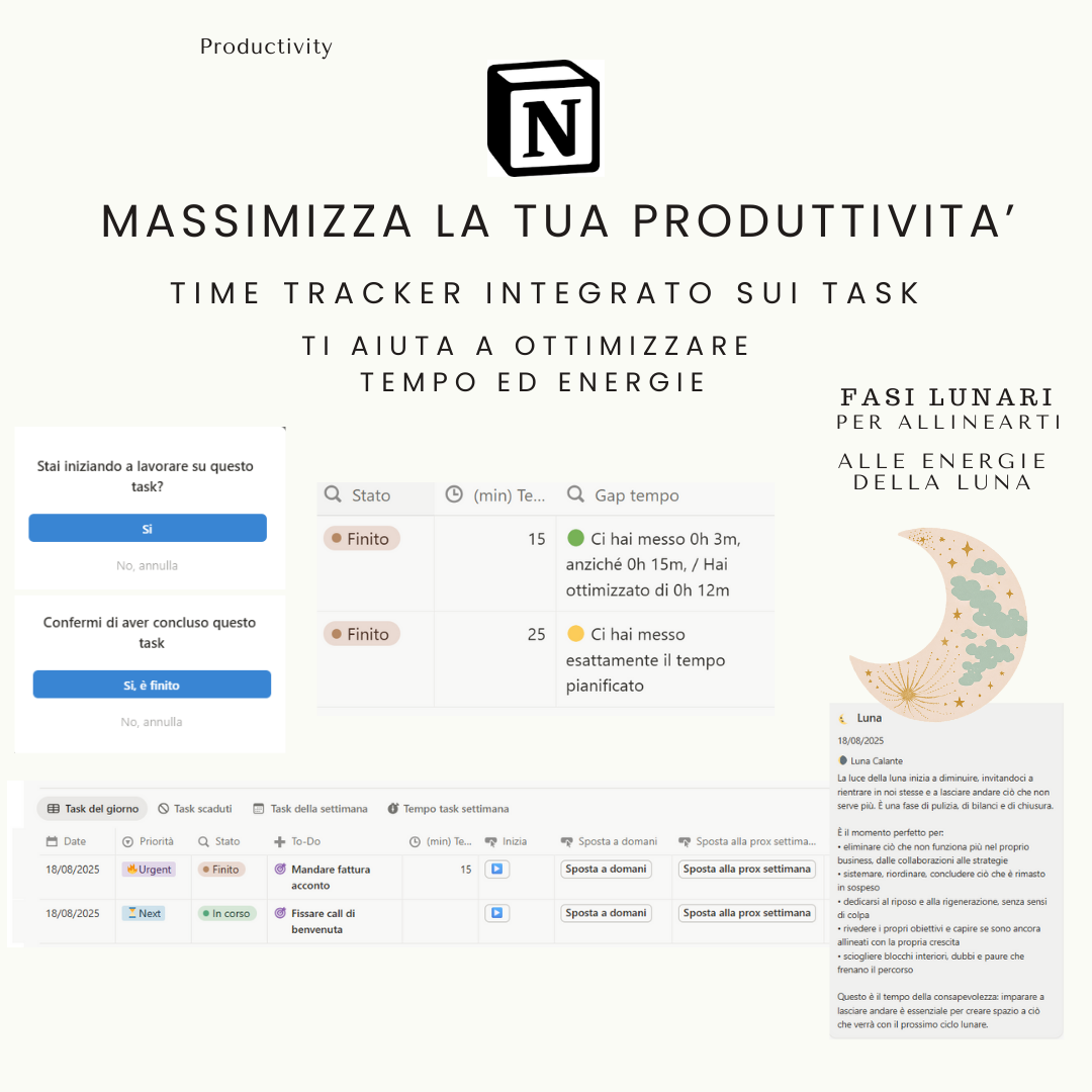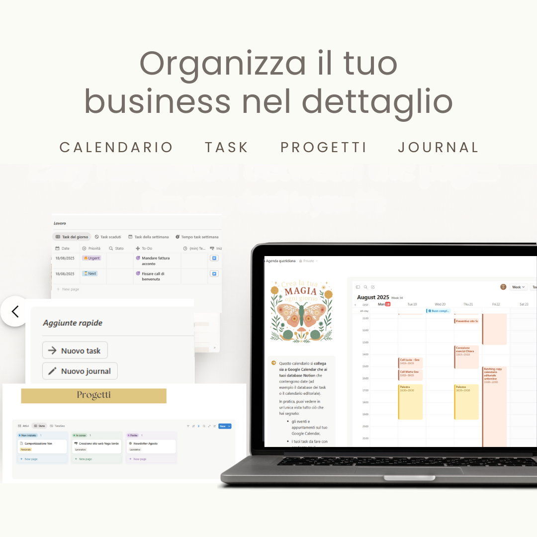 È come avere un ufficio digitale completo, un agenda super completa dove gestisci: clienti, progetti, fatture, scadenze, idee – tutto organizzato invece di essere sparso tra mille app diverse. Il nostro template è già pronto – tu lo scarichi e inizi subito a usarlo e la sua potenza è che puoi espanderlo e adattarlo al tuo business senza limiti.